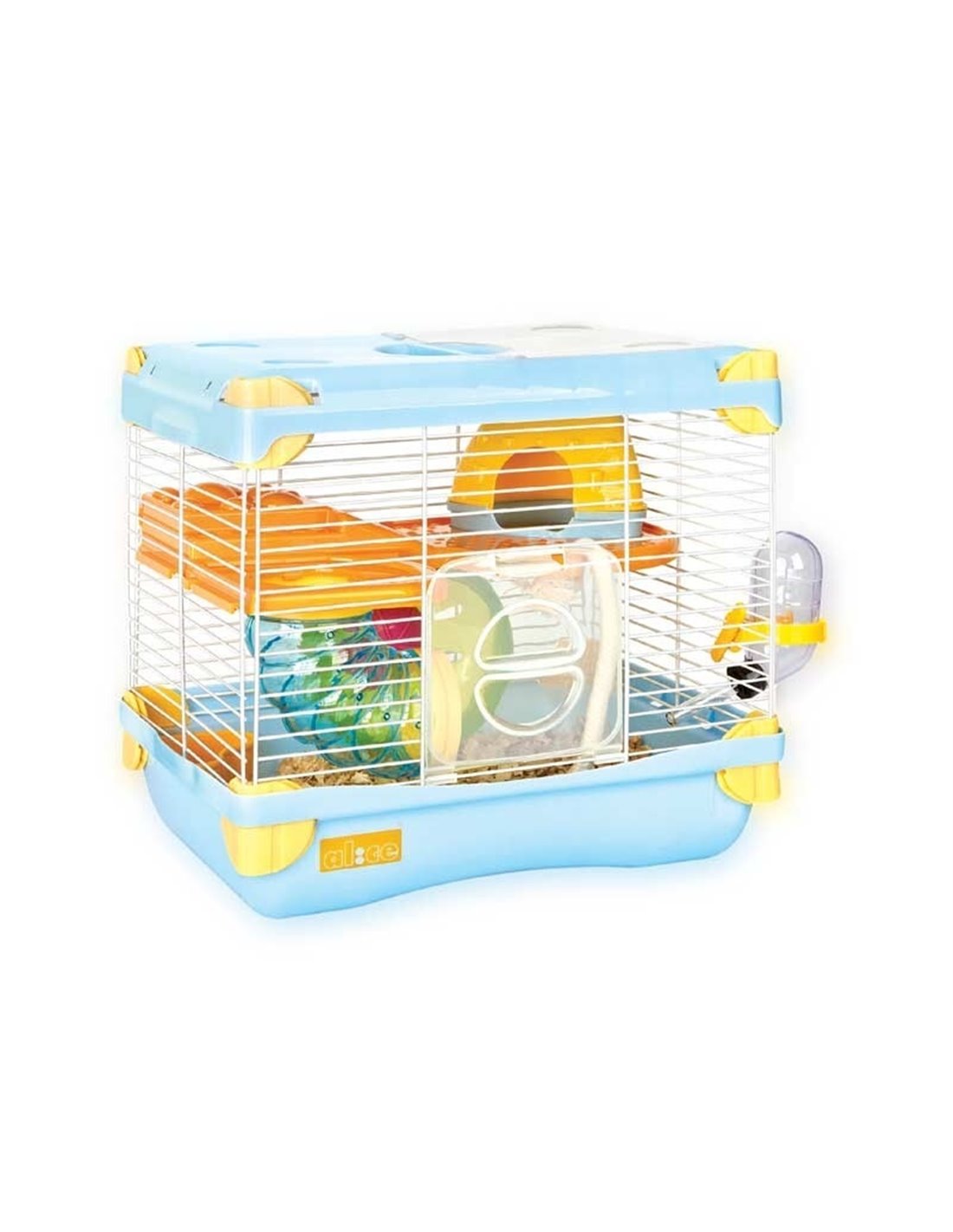 O cusca clasica pentru rozatoare GREMI din otel inoxidabil echipata cu un maner, o roata de jogging, un tunel, o casa, o platforma si adapator.