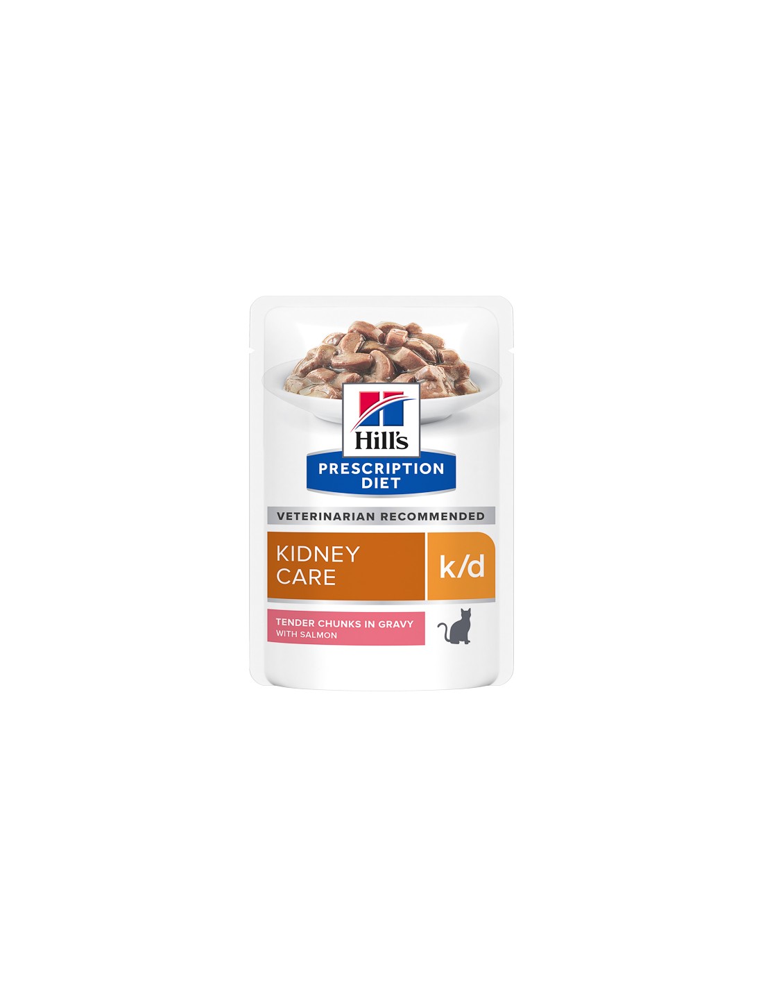 Hill's Prescription Diet K/D Hrană pentru pisici, cu somon, este o hrană completă pentru animale de companie care ajută la sprijinirea funcției renale în caz de insuficiență renală cronică sau temporară la pisicile adulte. Această hrană are un nivel scăzut de fosfor și un nivel redus de proteine, dar de înaltă calitate.