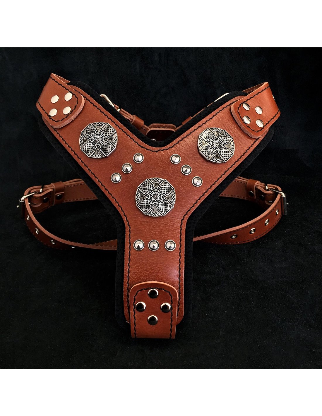 Dispune de 3 oranmente metalice argintii mari vechi, 9 nituri mai mici si captuseala moale de spuma ortopedica cu strat dublu brevetat pe placa pieptului.