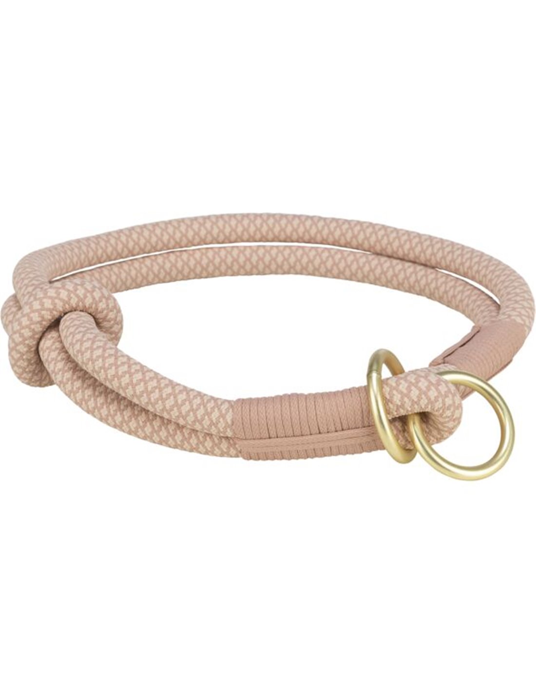 Zgarda semistrangulanta confectionata din franghie mata, tesuta rotund. Zgarda semistrangulanta ajuta la reducerea tragerii cainelui in timpul mersului. Daca cainele trage mai tare de lesa, zgarda se va strange pana la punctul de oprire stabilit. Cand cainele se opreste din trasul lesei, zgarda se largeste din nou si devine confortabila pentru caini. Punctul de oprire sau nodul zgarzii este reglabil: inainte de utilizare, punctul trebuie setat astfel incat animalul de companie sa nu poata aluneca din zgarda si sa nu fie niciodata prea strans cand este tras. Cu inel pentru lesa.