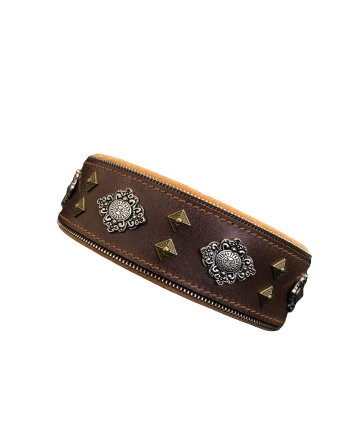 Decoratiunea este formata din nituri mari cu argint si nituri mai mici de piramida din alama. Aditional, un fermoar metalic face ca gulerul sa para si mai elegant si mai masiv.