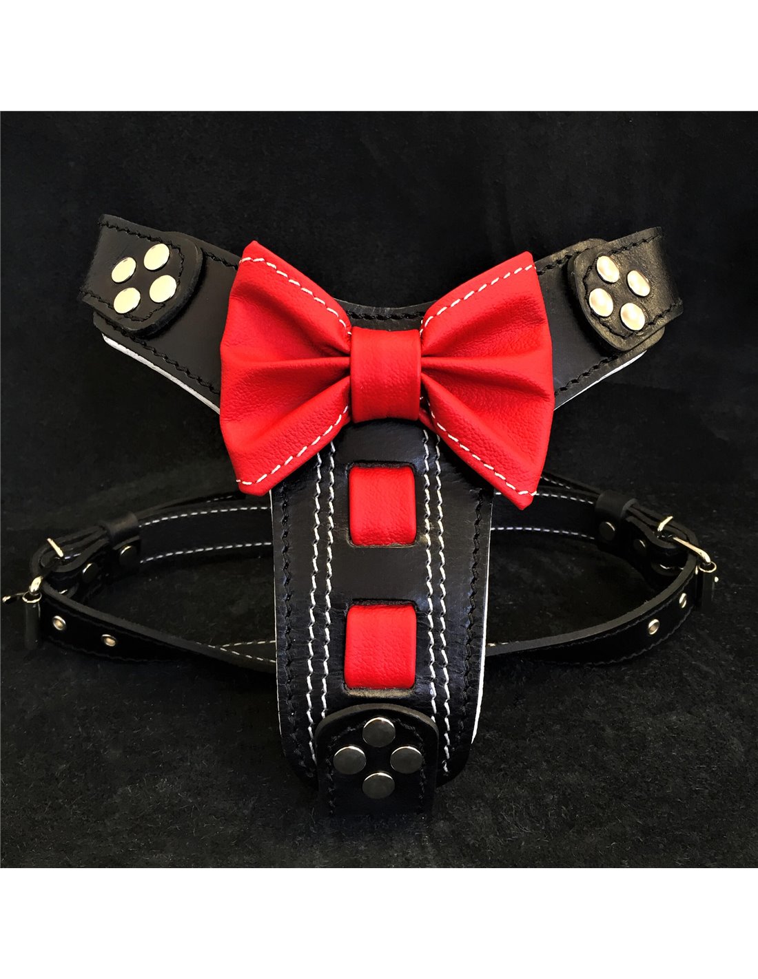 Culoarea principala a hamului "Bowtie" este negru, decorat cu un papion rosu.