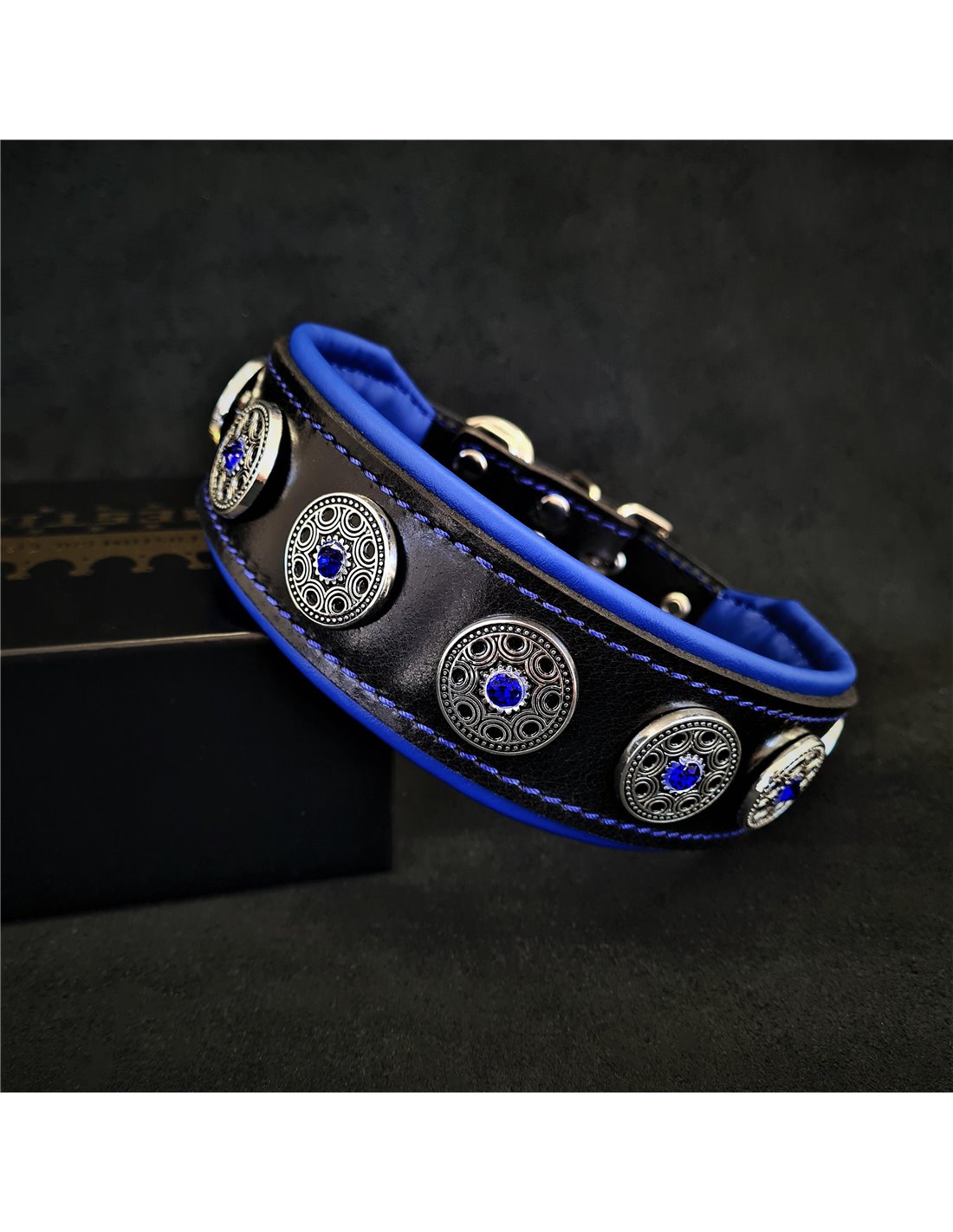 Zgarda „Bijou” este o bijuterie din piele pe care o poate purta cainele tau in fiecare zi. Aceasta zgarda are 7 (pana la 13) nituri decorative din argint vechi cu strasuri albastre de 6 mm latime.
