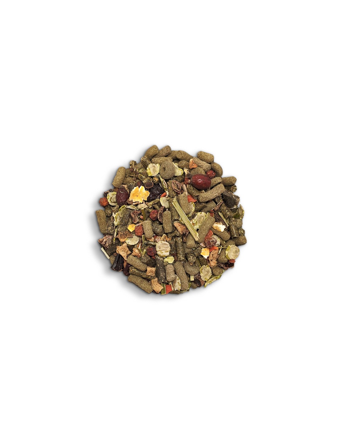 Ingrediente: lucernă, fân, fulgi de mazăre, roșcove, fulgi de orz, fulgi de porumb, grâu, porumb, măceșe uscate 2.7 %, mazăre, orz, morcovi uscați, mere uscate, tulpini de lucernă, minerale, pomadă de mere, scoruș uscat 1.1 %.