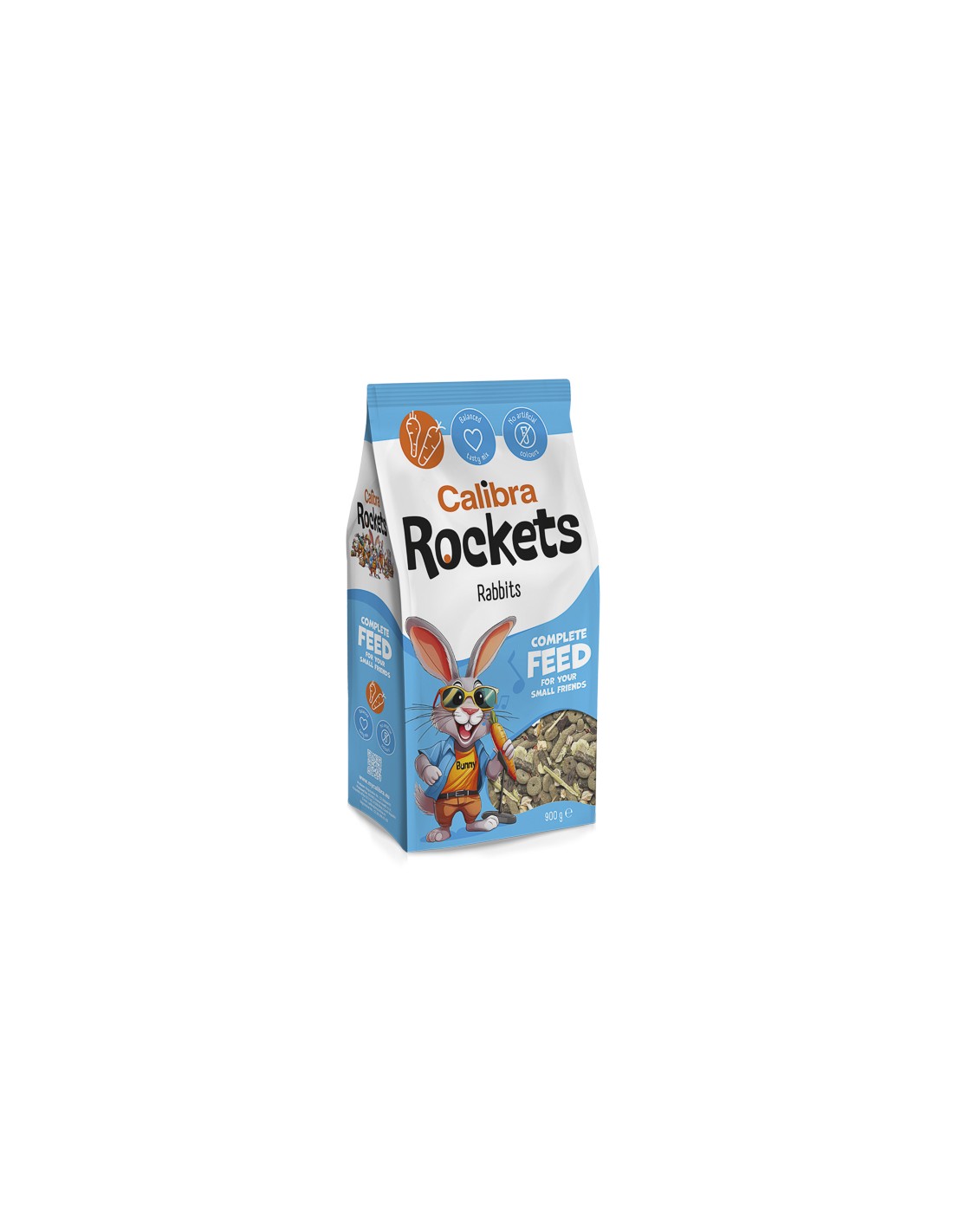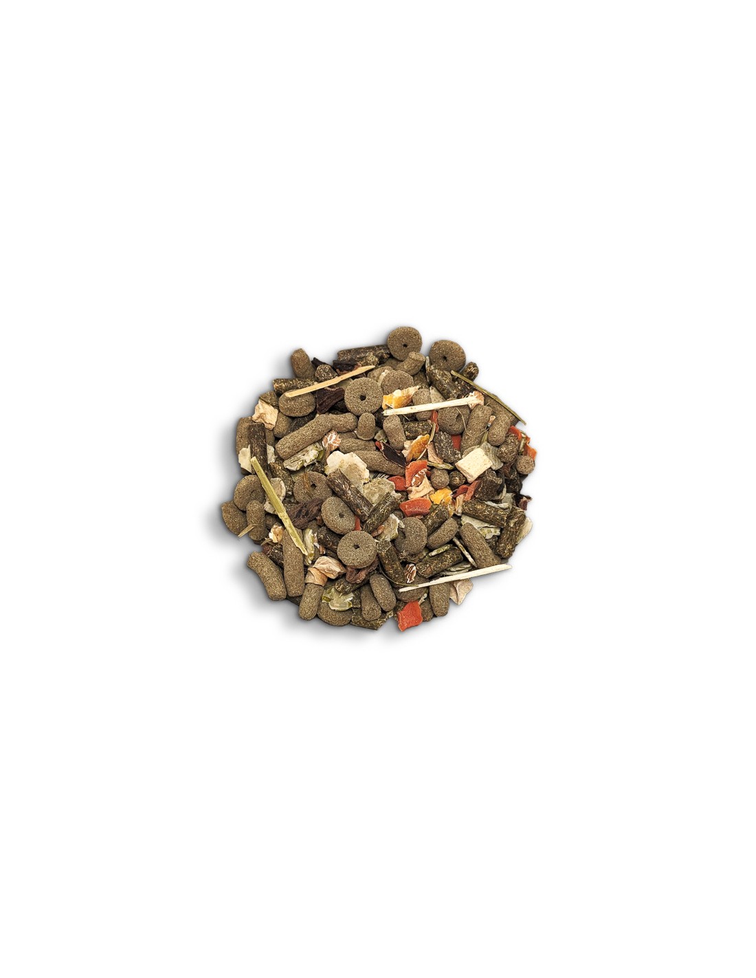 Ingrediente: lucernă, fulgi de mazăre, fân, roșcove, porumb, grâu, ovăz integral, felii de morcov uscate 3.3 %, fulgi de porumb, fulgi de orz, fulgi de grâu, semințe de floarea-soarelui decojite, tulpini de lucernă, mazăre, orz, pomadă de mere, felii de păstârnac uscate 1,8 %, minerale.