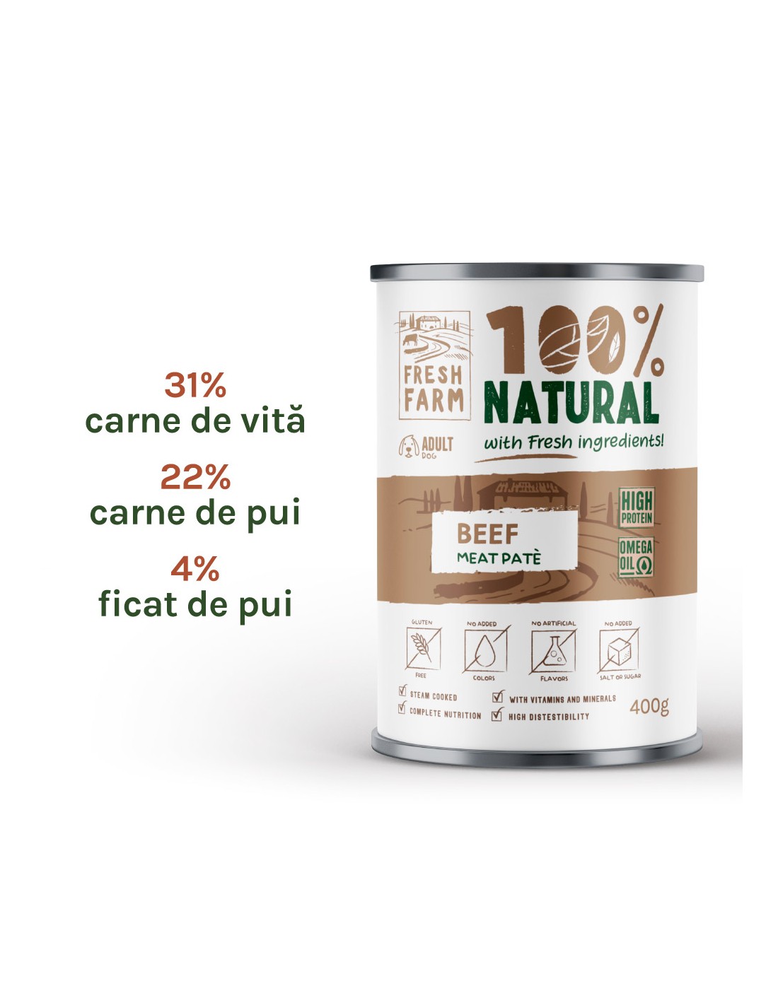 COMPOZIȚIE: carne de vită 31%, pui 22%, ficat de pui 4%, colagen 1%, făină de mazăre, 5% orez, ulei de somon 0,5%. ADITIVI/kg: vitamina D3 (E671) 200 UI, Vit. E (3a370) 150 mg, zinc (3b610) 15 mg, mangan (3b510) 3 mg, carbonat de calciu 2 mg. COMPONENTE ANALITICE: proteină brută 9%, grăsime brută 8%, cenușă brută 2,5%, umiditate 78%, fibre brute 0,5%, calciu 0,1%, fosfor 0,3%, sodiu 0,2%.