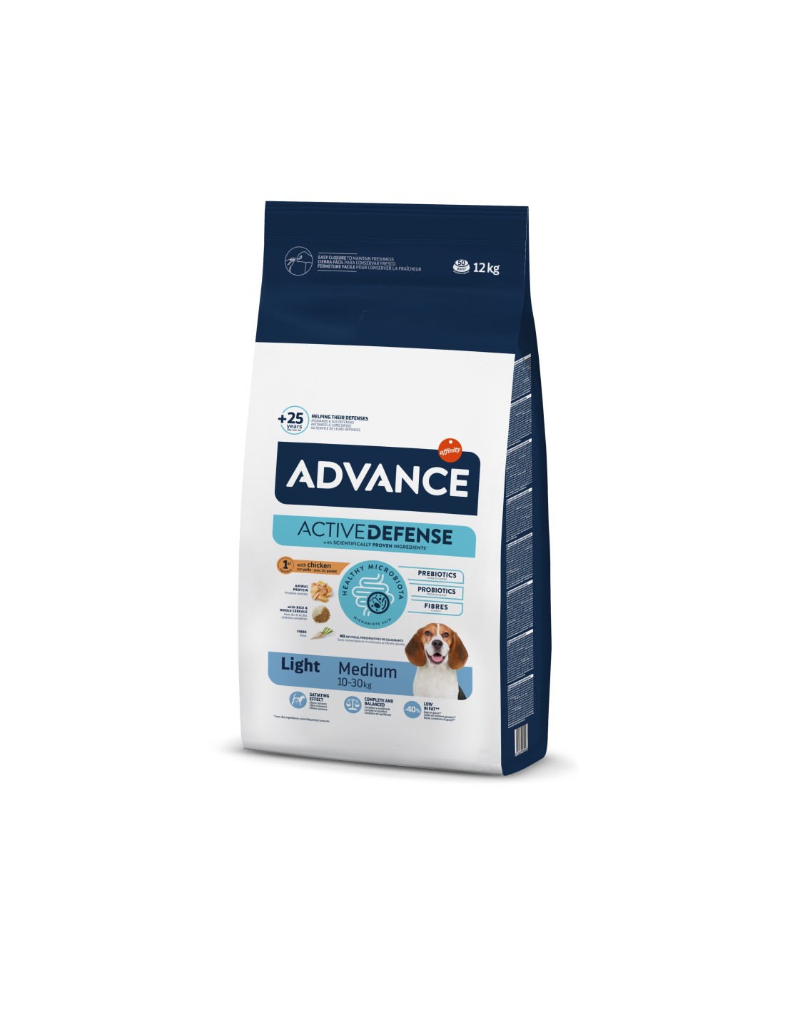 Advance Dog Medium Light este o hrana conceputa special pentru cainii adulti din rase de talie medie (cu o greutata la varsta adulta cuprinsa intre 10 si 30 kg), cu exces de greutate sau predispuse la obezitate.