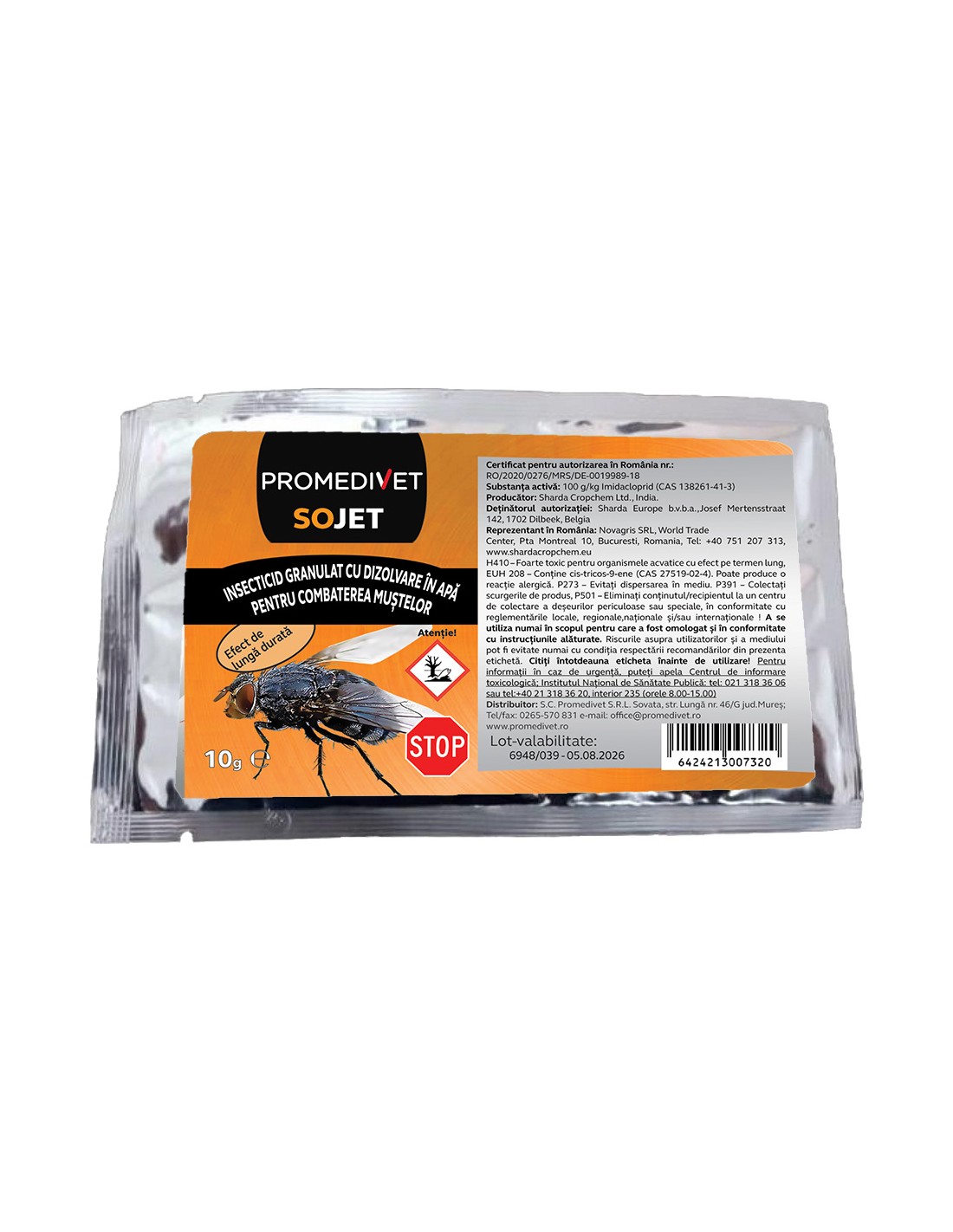 Insecticidul Sojet este folosit ca momeala pentru combaterea mustelor si actioneaza asupra receptorilor acetilcolinei din membrana postsinaptica a neuronilor. Insectele paralizeaza si mor. Este formulat pe baza de atractanti pentru muste si feromoni sexuali. Prin modul de conditionare produsul prezinta o eficacitate excelenta impotriva mustelor. Produsul contine si un agent amar BITREX care il face neplacut la gust si reduce astfel riscul de ingestie de catre copii si animale.