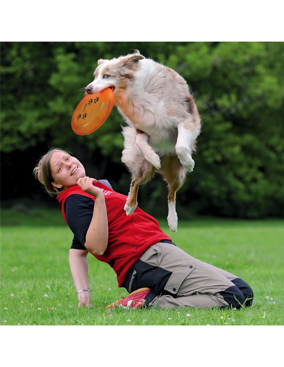 Discul pentru caini este fabricat din plastic flexibil, moale si durabil si are caracteristici optime de zbor. In plus, este rezistent la muscaturi si fara aschii. Jucaria a fost dezvoltata impreuna cu campioana de succes Karin Actun.