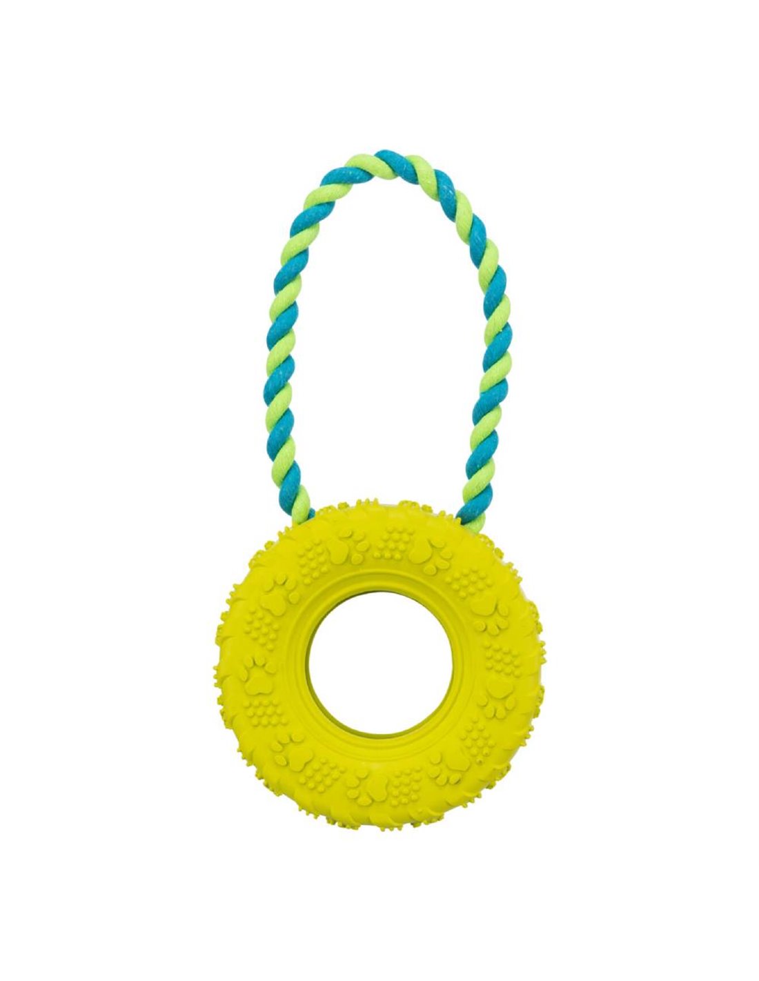 Jucarie anvelopa pe franghie, destinata pentru caini. Material: cauciuc natural. Dimensiune: 15/31 cm. Culoare: lime