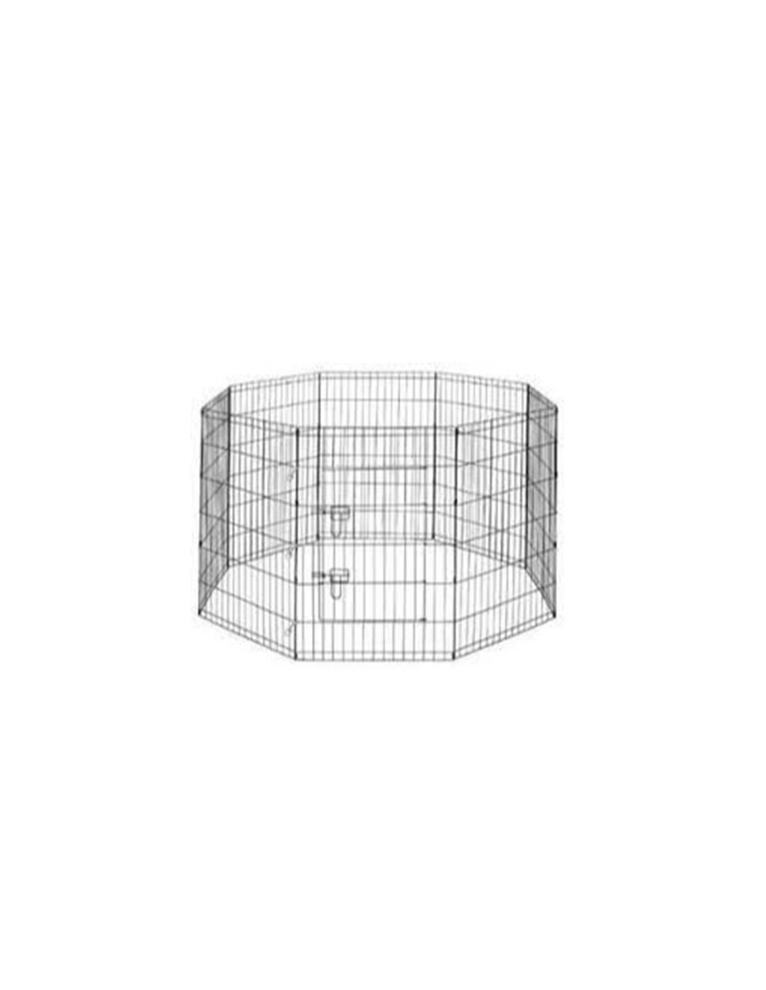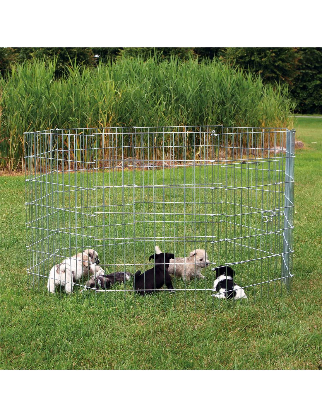 Tarc din otel zincat cu usa si 8 elemente de 61 × 91 cm. Extensibil cu rulari suplimentare. Recomandat pentru catelusi si caini de talie medie. Potrivit pentru uz interior si exterior. Usor de asamblat, nu sunt necesare unelte. Usa intr-un singur panou pentru acces usor cu incuietori.