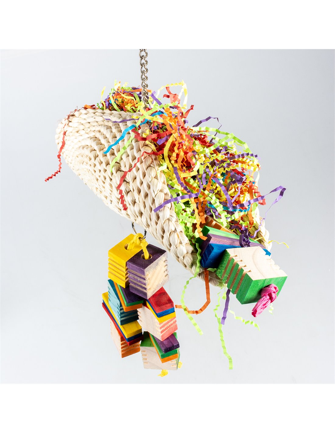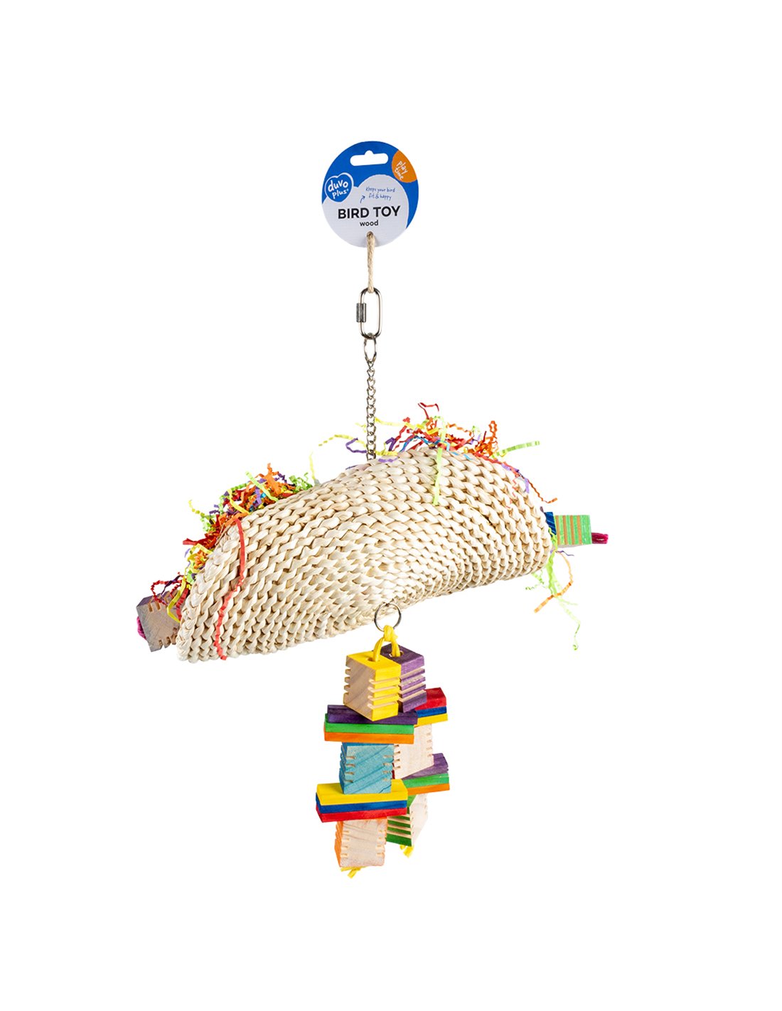 Acest pandantiv taco duvoplus este realizat din lemn de pin, porumb tesut si hartie maruntita. O jucarie naturala distractiva pentru catarat si rontait. Pentru distractie suplimentara, puteti pune gustari in santuri. Iti mentine pasarile fericite si active! Il poti atasa cu usurinta in orice voliera folosind carligul.