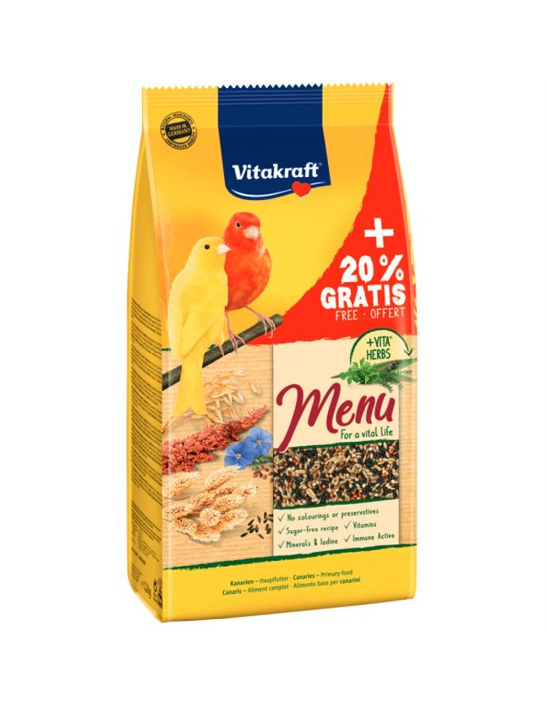 Ingrediente: seminte 64,7% (semintele canarilor 25%, seminte de in 5,7%) ,cereale (mei 29,8%, ovaz 2,5%), minerale,uleiuri si grasimi, derivate de origine vegetala, miere 0,02%, drojdie(beta glucans 80mg/kg).