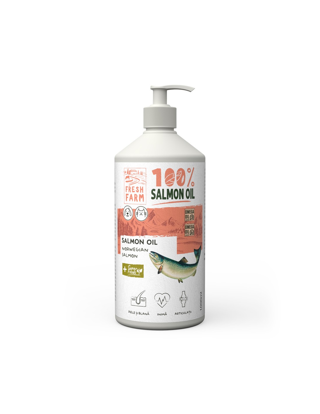 Compozitie: ulei de somon. Contine acizi grasi esentiali Omega 3, Omega 6 si antioxidanti: Vitamina E, D. Acizii grasi EPA si DHA nu pot fi sintetizati de organism si trebuie administrati din surse externe. Epa este parte a membranei celulare, DHA contribuie la mentinerea structurii neuronale, inclusiv a creierului si a retinei imbunatatind plasticitatea sinaptica. Impreuna, au efect antiinflamator, contribuind la functionarea sanatoasa a intregului organism si la mentinerea unei membrane celulare fluide si permeabile. Acizii grasi Omega 3 sunt indispensabili pentru mentinerea unei sanatati optime; ei reduc riscurile cardio-vasculare si au un efect benefic general asupra functionarii intregului organism (probleme articulare, de imunitate, probleme de piele si blana, starea generala de sanatate). Uleiul de peste, spre deosebire de cel din surse vegetale este de ajutor in tratarea aritmiilor si previne ischemia cardiaca. O dieta bogata in Omega 3 si Omega 6, intr o proportie echilibrata,
