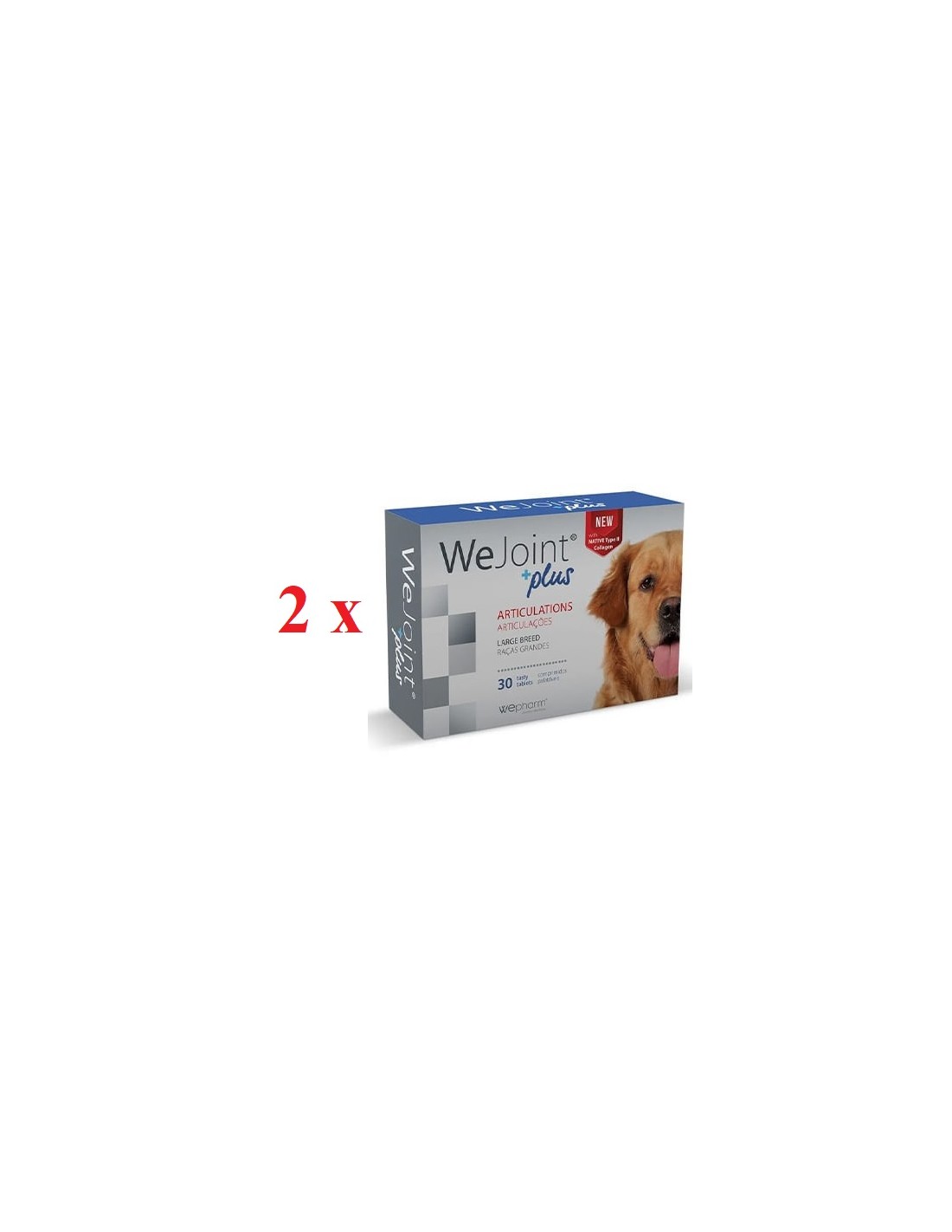 WeJoint este un supliment alimentar sub forma de comprimate dedicat cainilor de talie mare. Vine in sprijinul cainilor predispusi la probleme articulare si a celor care executa o suprasarcina in articulatie fie prin efort fizic excesiv, fie datorat procesului de crestere. WeJoint este un condroprotector si ajuta in controlul durerii, infraneaza inflamatia, contribuie la regenerarea articulara si la intarirea articulatiei.