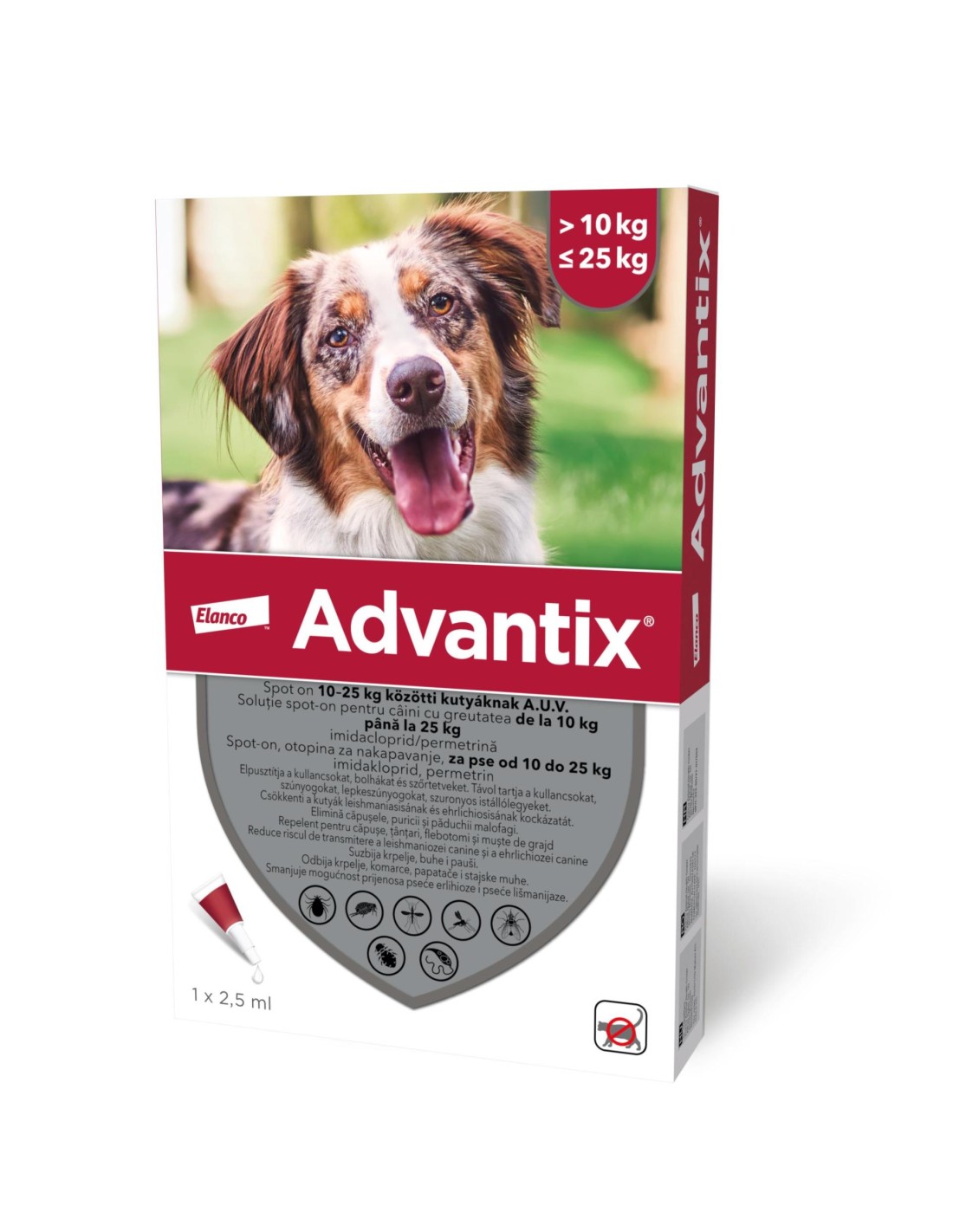 Advantix, Spot On, pentru caini cu masa corporala cuprinsa intre 10 si 25 kg, asigura protectia cainelui dumneavoastra impotriva capuselor, purecilor, paduchilor, tantarilor si mustelor hematofage, pentru o perioada de pana la 4 saptamani.